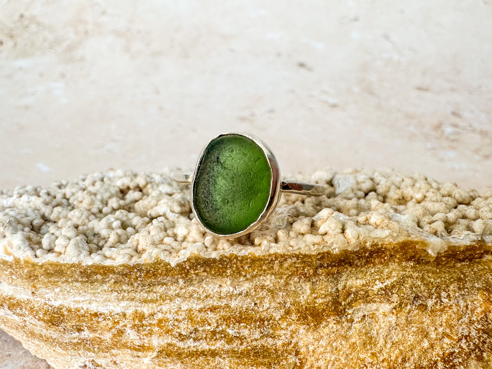 This unique sea glass ring was handmade with recycled sterling silver and a genuine piece of deep green sea glass, found by me along the beautiful Devon coast. Each piece of sea glass carries its own story, naturally shaped and smoothed by the sea over many years, making this ring a one-of-a-kind treasure.