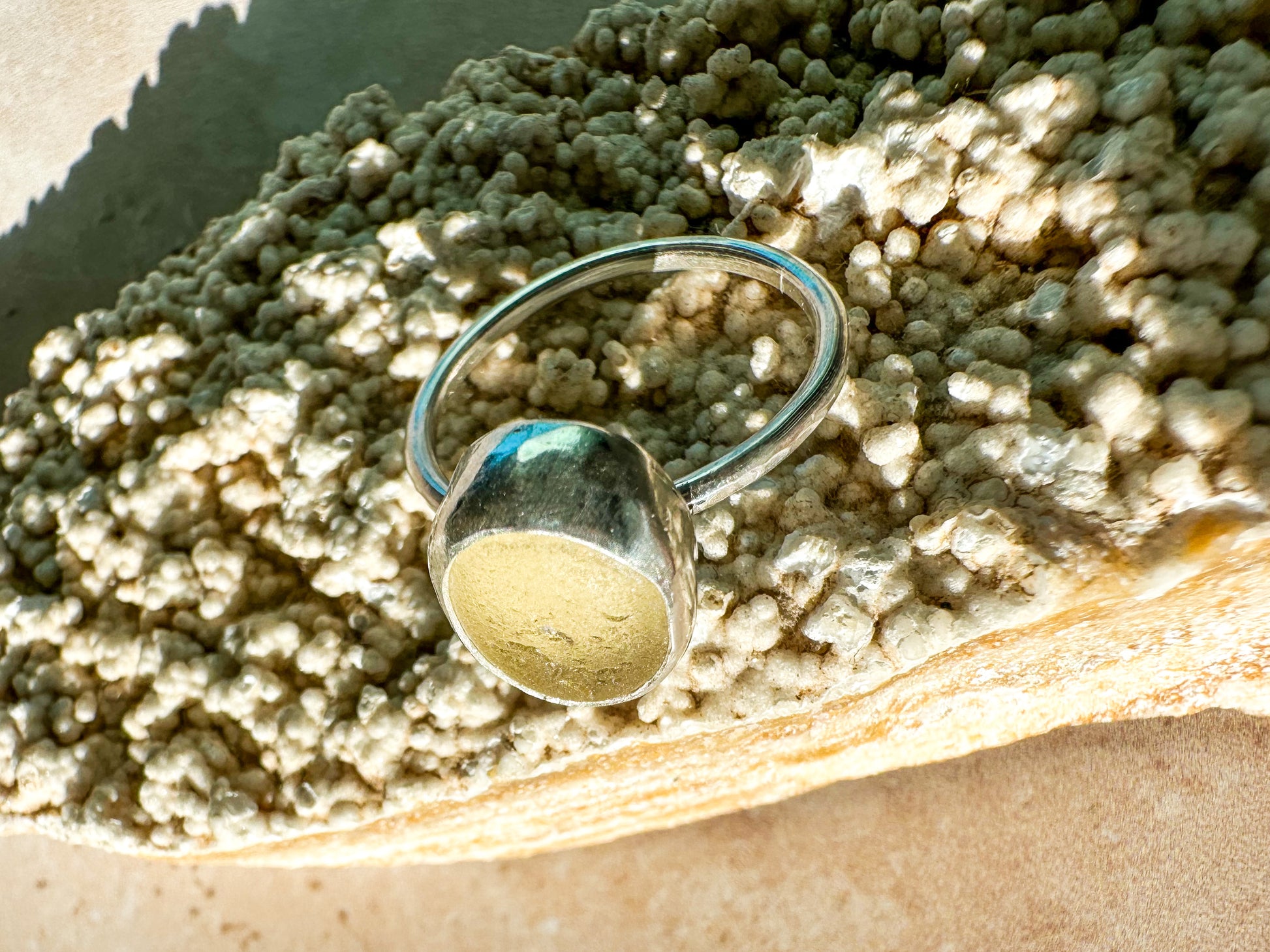 This pale yellow Seaham sea glass ring features a beautifully smooth piece of genuine sea glass, collected from the famous Seaham beach - known for its unique, historic glass remnants from the Victorian bottleworks. This soft yellow piece has been perfectly rounded and frosted by decades in the North Sea, giving it a warm, subtle glow.
