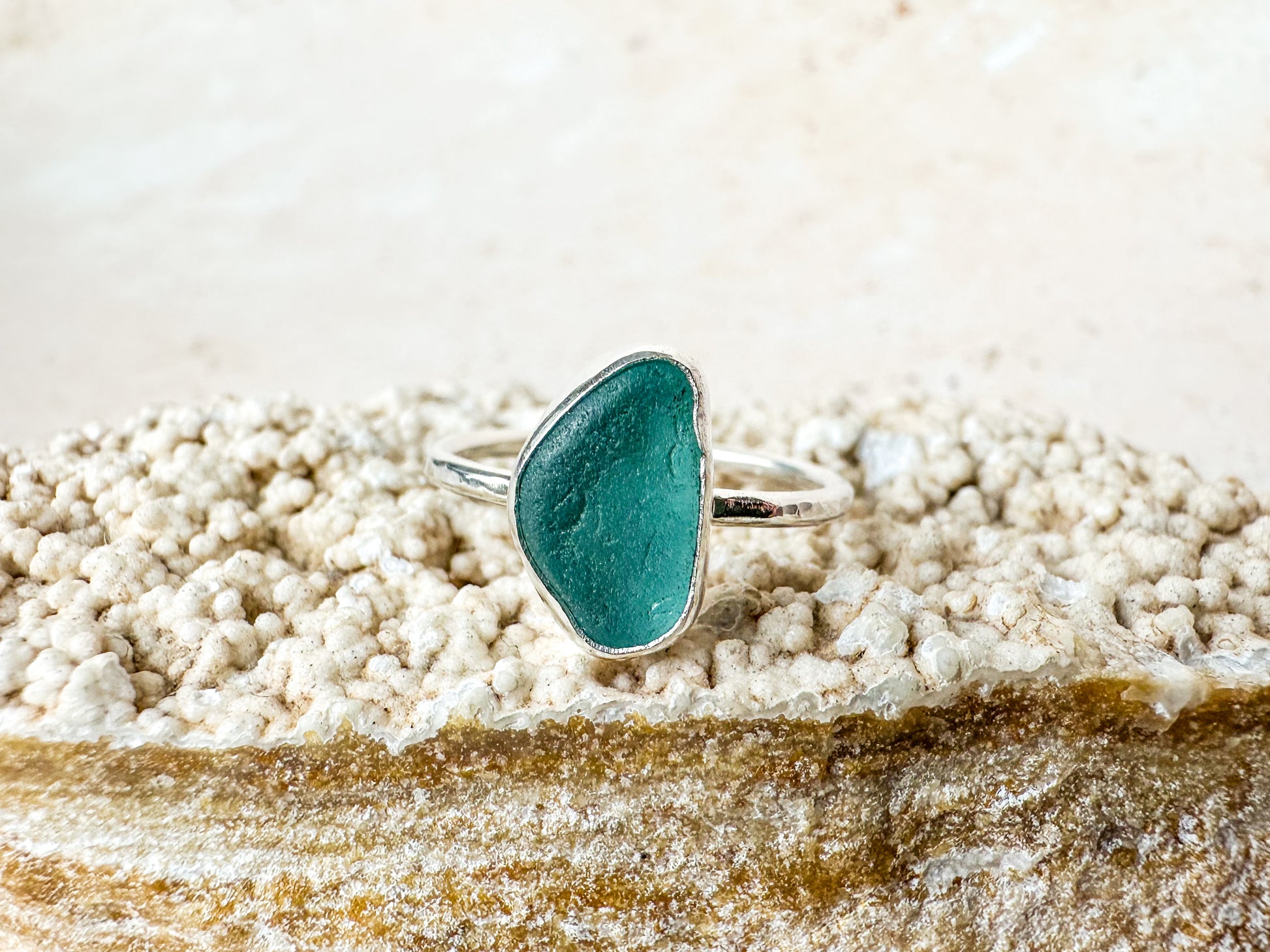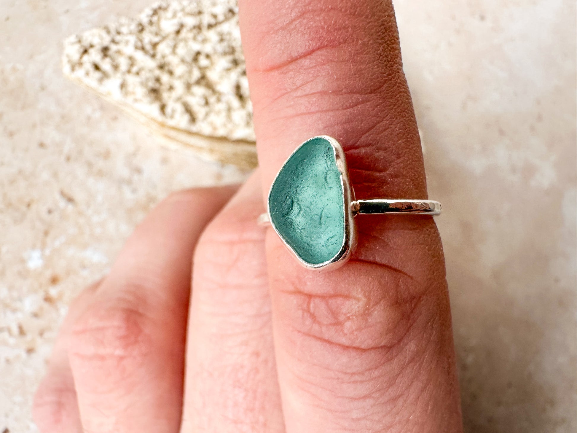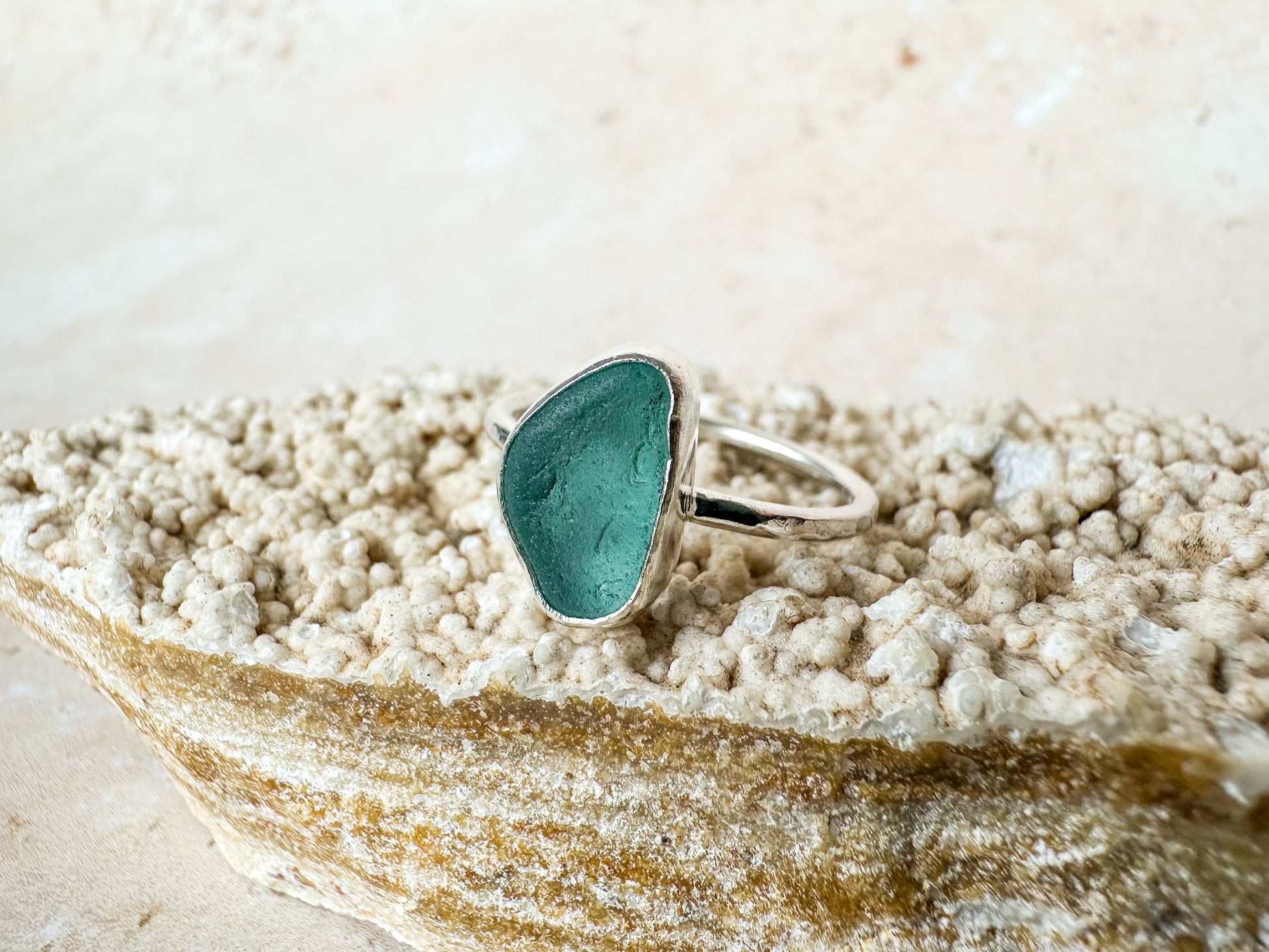 I’ve created a custom sterling silver setting to follow the natural shape of the glass, with a slim silver band that keeps the focus on the sea-worn surface. Each step of the process, from shaping the bezel to finishing the ring, was done by hand.