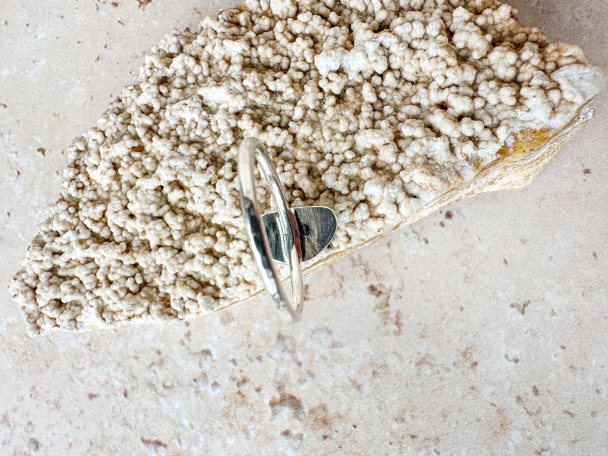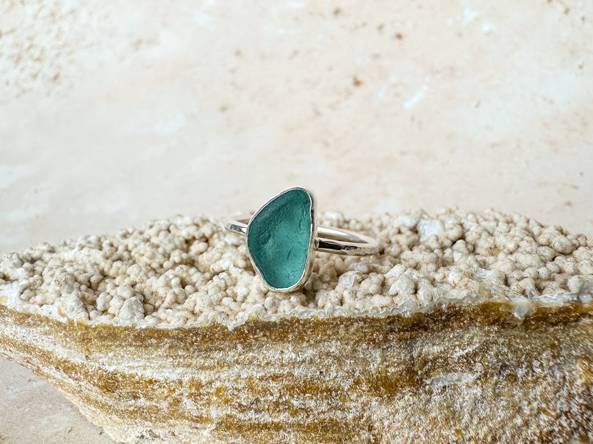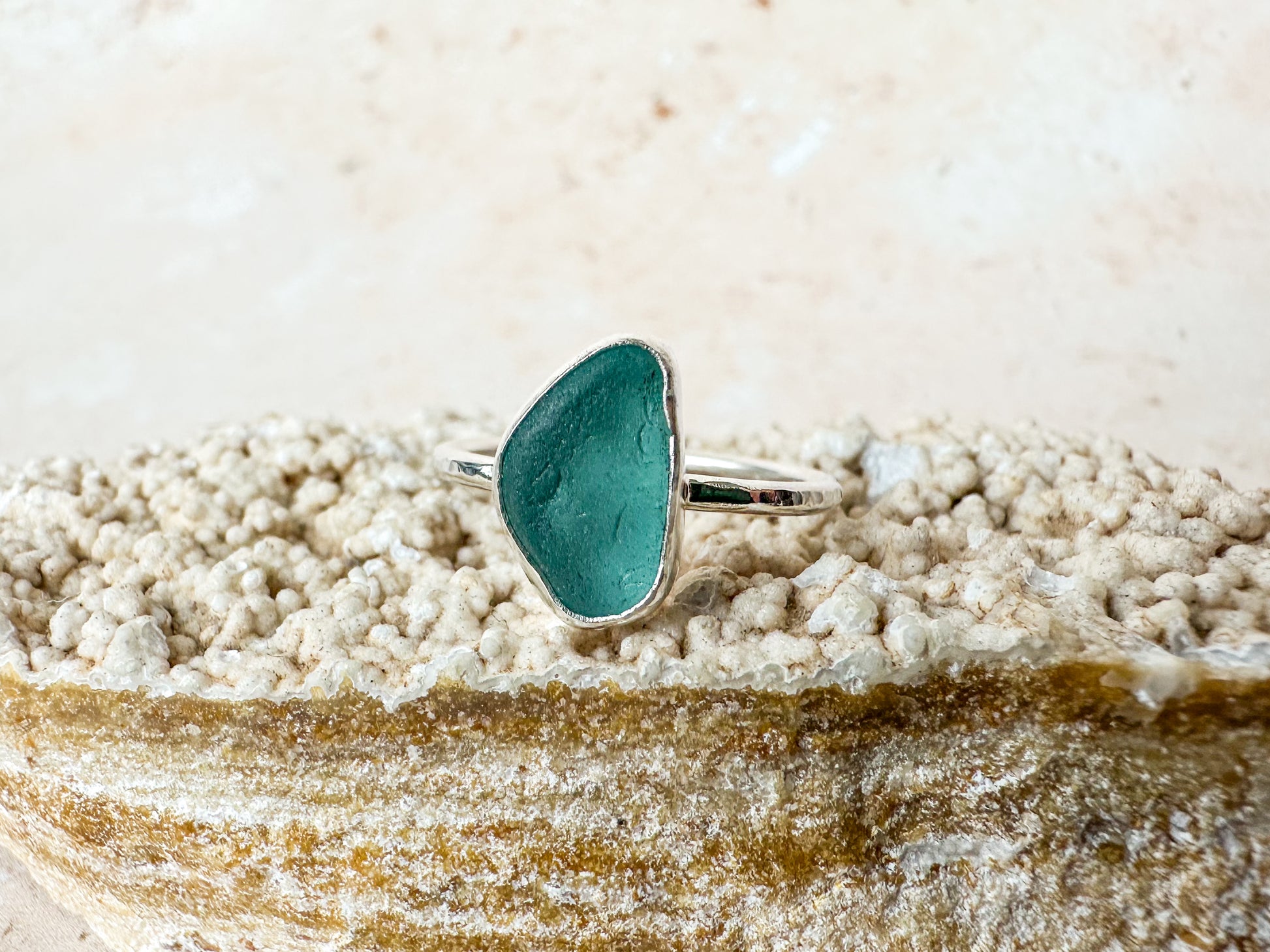 I’ve created a custom sterling silver setting to follow the natural shape of the glass, with a slim silver band that keeps the focus on the sea-worn surface. Each step of the process, from shaping the bezel to finishing the ring, was done by hand.