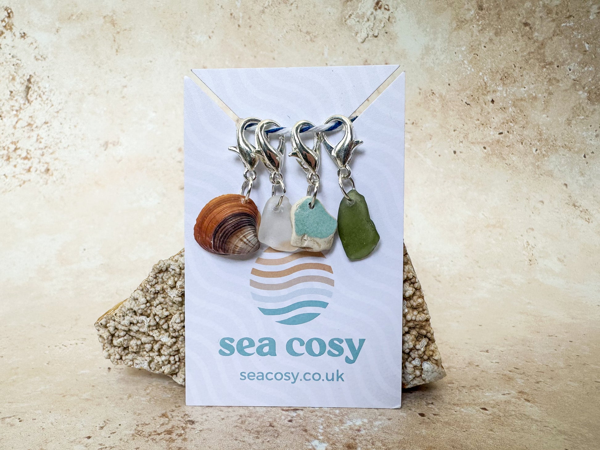 Combine your love for crochet with some coastal coziness with these sea glass, sea pottery and sea shell crochet stitch markers. Hanging on 15mm lobster clasps and jump rings, these stitch markers are very lightweight and add a pop of colour to any crochet project.
